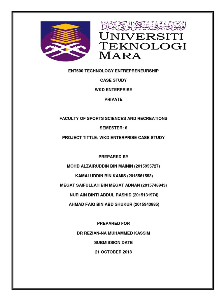 The course that we take is diploma in mechanical engineering and out group consist of 5 member which are shuhada. Wan mohamed to write up a report on uitm kota bharu campus students' lifestyle. Case study method is a descriptive analysis of people, group, event or policies that are studied by using one or more processes. It can focus on a person, group, event or organization. All uitm students who further their study at bachelor level need to take principles of entrepreneurship course or ent530 to give guideline and expose students to the business orientation.