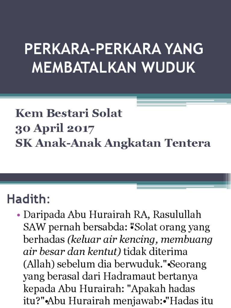 Perkara Membatalkan Wuduk Ogretim Kaynaklari from az779572.vo.msecnd.net Ulama berbeda pendapat dalam memahami dua hadis di atas. Semoga artikel ini bermanfaat bagi penuntut ilmu dan bagi saya sendiri, serta menjadi salah satu tebusan saya di hari akhirat nanti memperoleh masuk syurga. Uraikan pendapatmu tentang perkembangan media komunikasi dari masa lalu sampai zaman modern saat ini. 1.1 sesuatu yang keluar dari dua jalan. 6 perkara yang membatalkan wudhu. Sekiranya solat itu batal maka wajib dia mengulangi semula solat tersebut. Adapun, perkara yang membatalkan wudhu, apabila bertemu dua kemaluan (berjimak), keluar air mani, dan. Perkara yang keluar dari salah satu dua jalan (kemaluan dan anus).