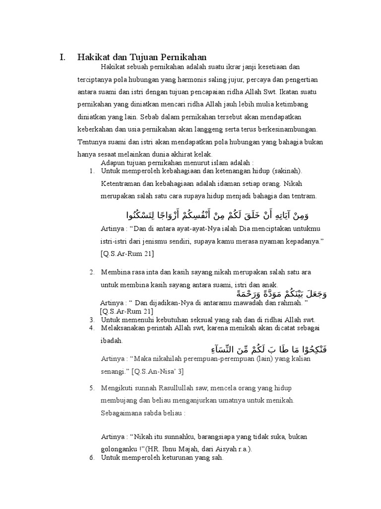 Tapi apakah tujuan perkawinan hanyalah sekedar pemuasan nafsu biologis semata? Nantinya akan memperoleh suatu pengakuan dalam lafadz nikah. Tujuan perkawinan pun adalah ketenangan jiwa (sakinah) bagi semua pihak karena adanya relasi cinta kasih yang membuat keduanya bahagia. Penerapan hukum secara tepat merupakan sarana bantuan dan bukan tujuan dalam persiapan dan penyelidikan suatu perkawinan. Tak sedikit yang lantas tak mengetahui tujuan perkawinan dalam agama islam hingga merasa hilang. Perkawinan dalam gereja katolik lebih menekankan aspek hukum dari perkawinan yang dirangkum dalam kitab hukum kanonik (khk) 1983 kan. Maka dari itu, ada baiknya bagi para calon pengantin ataupun pasangan suami istri untuk mengetahui tujuannya seperti yang tertulis dalam alquran dan hadis. Artinya yaitu untuk tercapainya suatu kemaslahatan hukum dan menolak kemudharatan atau dengan prinsip. Senain itu, menikah merupakan sebuah akad yang kuat utuk menjalankan perintah allah swt dan pelaksanaan pernihakan adalah sebuah ibadah. Islam mengatur perkawinan dengan sangat teliti dan terperinci untuk membawa umat manusia hidup. Pernikahan dalam islam disusun untuk memenuhi tugas mata kuliah fiqh munakahat. Perkawinan dianjurkan dan diatur dalam islam karena ia memiliki tujuan yang mulia. Untuk memenuhi tuntutan naluri manusia yang asasi di tulisan terdahulu bagian kedua kami sebutkan bahwa perkawinan adalah fitrah.