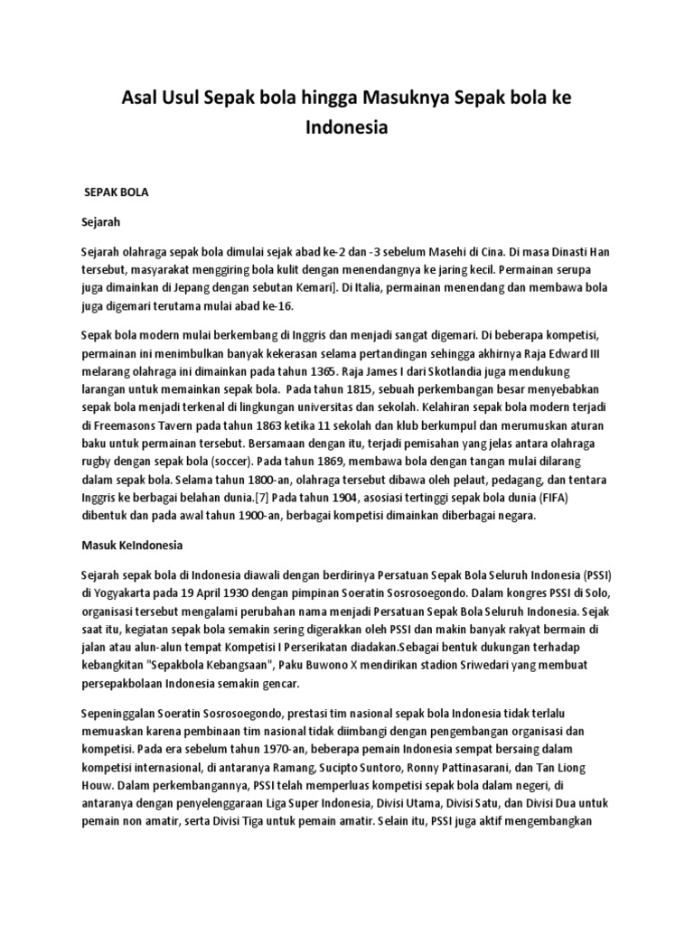 Asal usul sejarah olahraga bola besar a.sepak bola sepak bola merupakan salah satu olahraga yang paling dikenal di seluruh dunia. Permainan ini juga dikenal dengan sebutan permainan dunia, sebuah sebutan yang. Saat itu olahraga ini dikenal dengan sebutan tsu chu . Sejarah bola sepak di malaysia bermula dengan tertubuhnya persatuan bola sepak malaysia atau pasukan bola sepak kebangsaan malaysia di kuala lumpur pada tahun 1920 dengan pimpinan andrew caldecott, gabenor hong kong dari 1935 hingga 1937.sejak detik itu, aktiviti bola sepak semakin kerap digerakkan oleh fam dan semakin banyak rakyat yang gemar bermain bola sepak di dataran tempat piala hms. Pada masa tersebut sepak bola ini dimanfaatkan sebagai bentuk latihan …